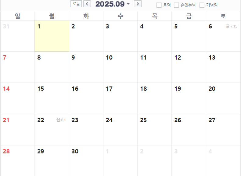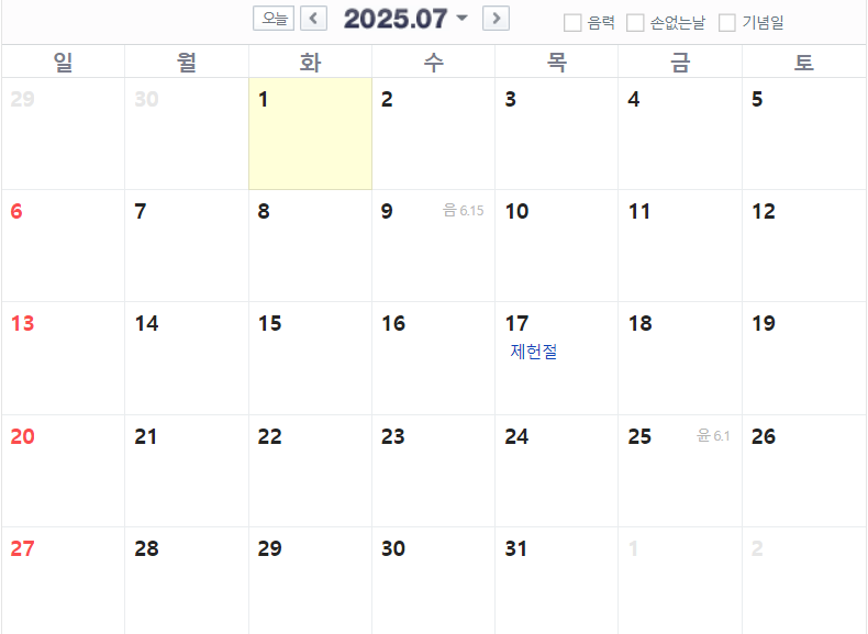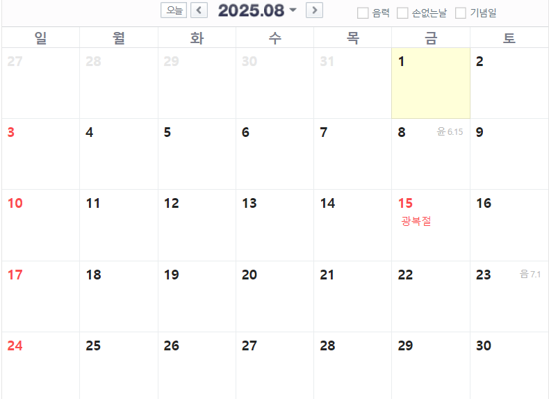 8월은 8월 15일(금) 광복절이 있습니다. 금요일에 휴일이므로 여름 휴가 가시는 분들은 참고하시면 좋을 것 같습니다.
