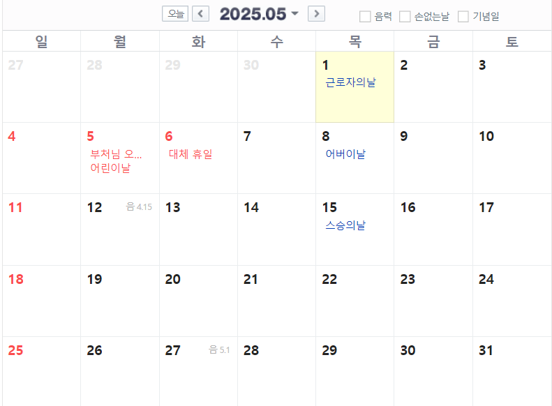 5월은 5월 5일(월) 부처님 오신 날 및 어린이날이 있습니다. 5월 6일(화)은 대체공휴일이 될 예정입니다. 또한 달력에는 빨간날로 표시되지 않았지만 5월 1일(목)은 근로자의 날로 해당되는 직장인은 휴일로 쉴 수 있습니다. 따라서 5월 2일(금)에 휴가를 쓴다면 6일간의 휴일을 즐길 수 있게 됩니다.