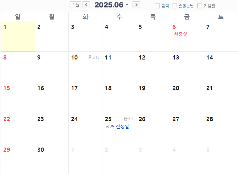 6월에는 6월 6일(금)에 현충일이 있습니다.