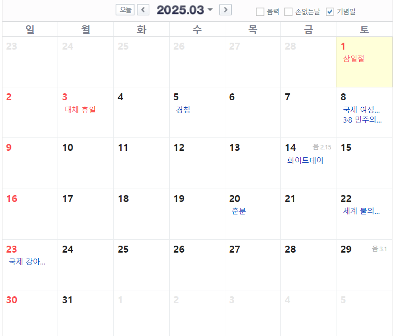 3월은 3월 1일(토) 삼일절이 있습니다. 삼일절이 주말이기 때문에 대체공휴일로 3월 3일(월)이 휴일이 될 예정입니다.