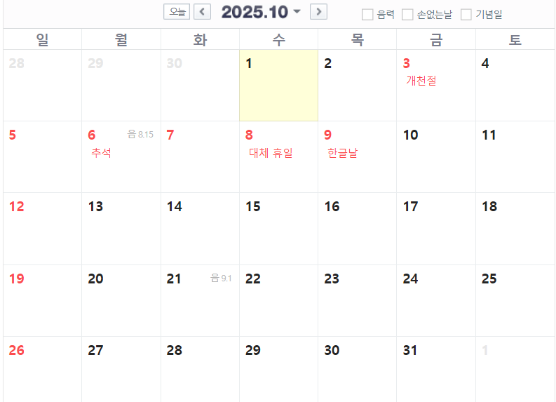 2025년 10월은 역대급 휴일이 예상되는 달입니다. 10월 3일(금) 개천절을 시작으로 10월 5일(일)~10월 7일(화) 추석 연휴, 10월 8일(수) 대체공휴일, 10월 9일(목) 한글날이 있습니다. 공휴일과 주말만으로 10월 3일부터 10월 9일까지 7일을 쉴 수 있으며, 10월 10일(금)에 휴가를 사용한다면 10월 12일까지 총 10일의 휴가를 보낼 수 있게 됩니다.