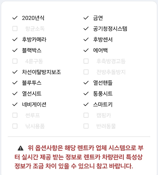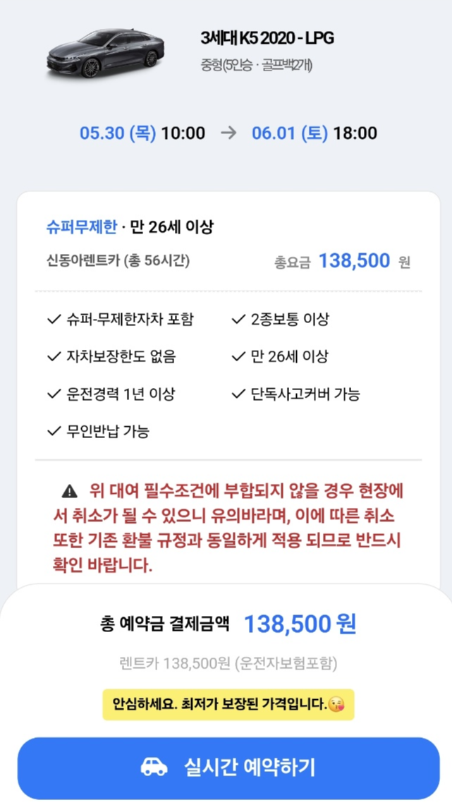 제가 렌트카를 고를 때 본 조건은 1) 완전자차, 슈퍼무제한 보험, 2) 블랙박스, 후방카메라 장착, 3) 블루투스 연결 가능이었습니다. 그 모든 조건을 만족하고, 가격도 합리적이어서 신동아 렌트카를 선택하게 되었습니다.