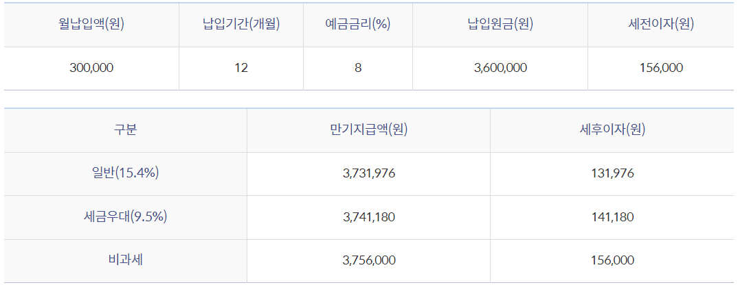 연8%의 최대금리로 월 30만원씩 12개월간 저축했을 때 받을 수 있는 세전 이자는 156,000원입니다. 과세 비율에 따라 최종 지급액이 달라지겠는데요, 비과세의 경우 3,756,000원 / 세금우대의 경우 3,741,180원 / 일반과세자의 경우 3,731,976원이 되겠습니다. 본인의 월 납입액과 예금금리를 따져 만기지급액을 미리 계산해보시면 좋을 것 같습니다.